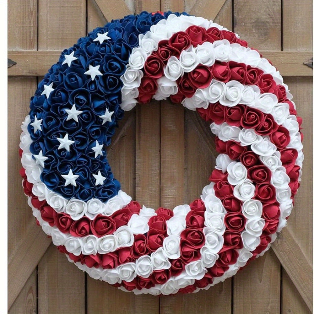 15.7 Inch Patriotic Roses Wreath, 4Th of July Summer Soft Touch Foam Roses Wreath for the Front Door, Handcrafted