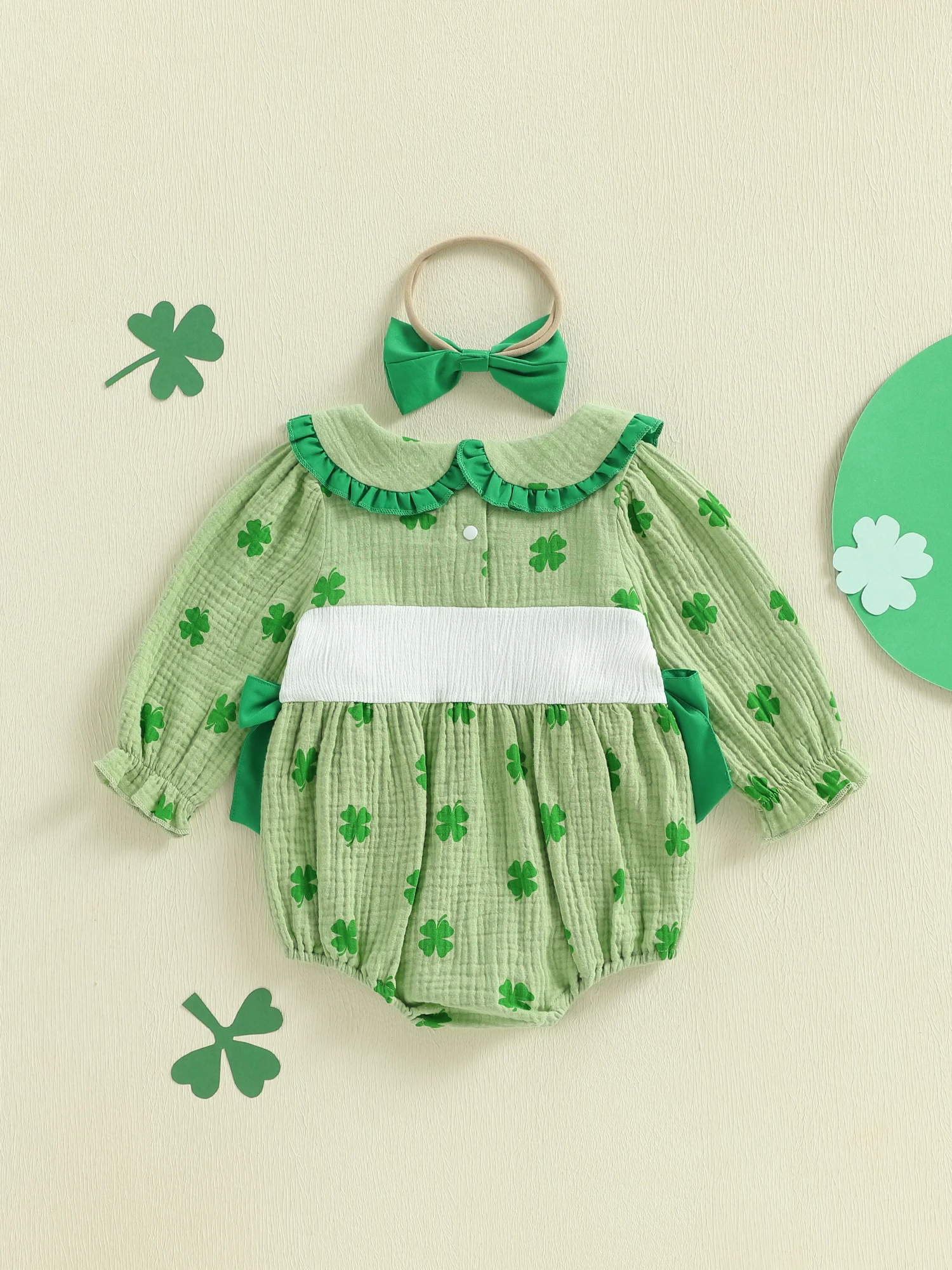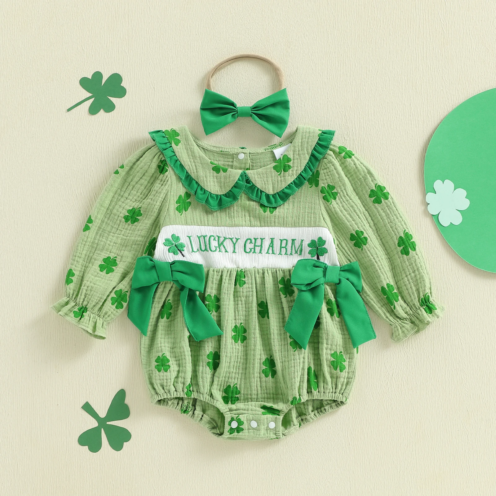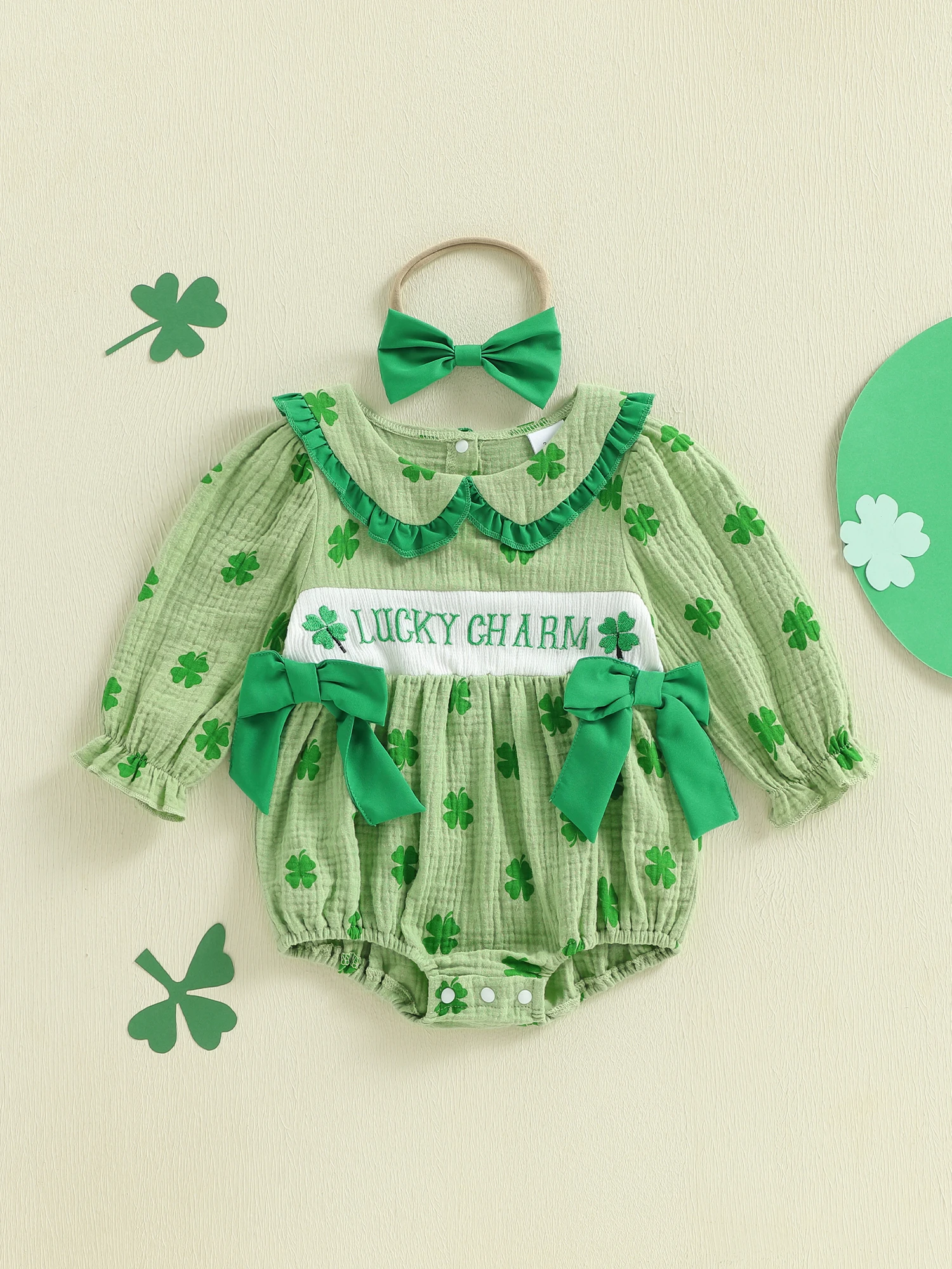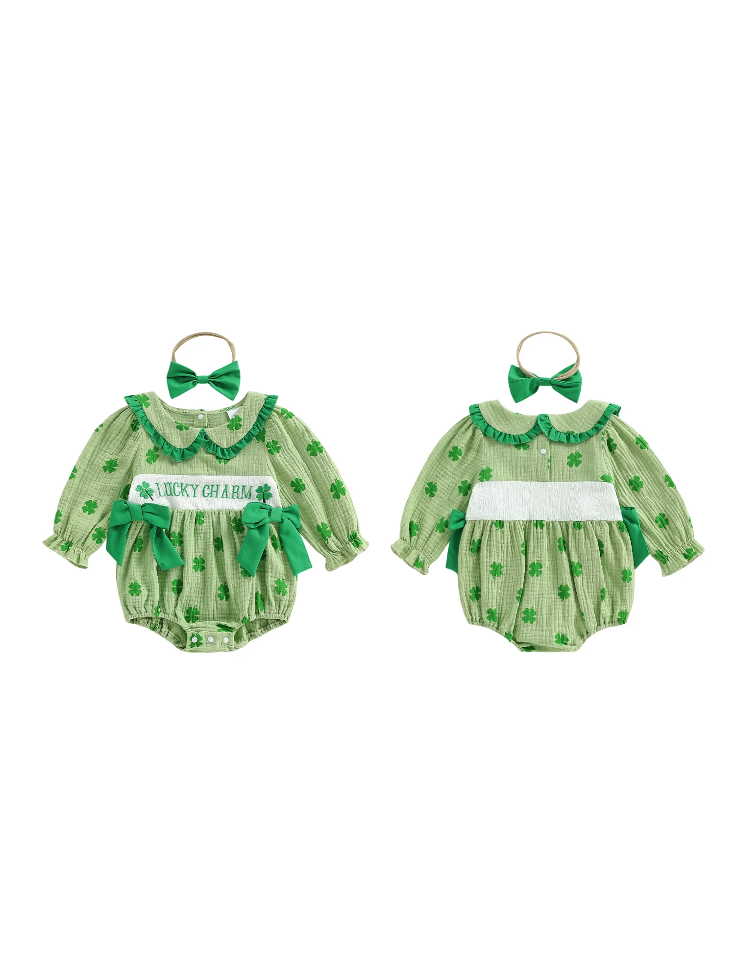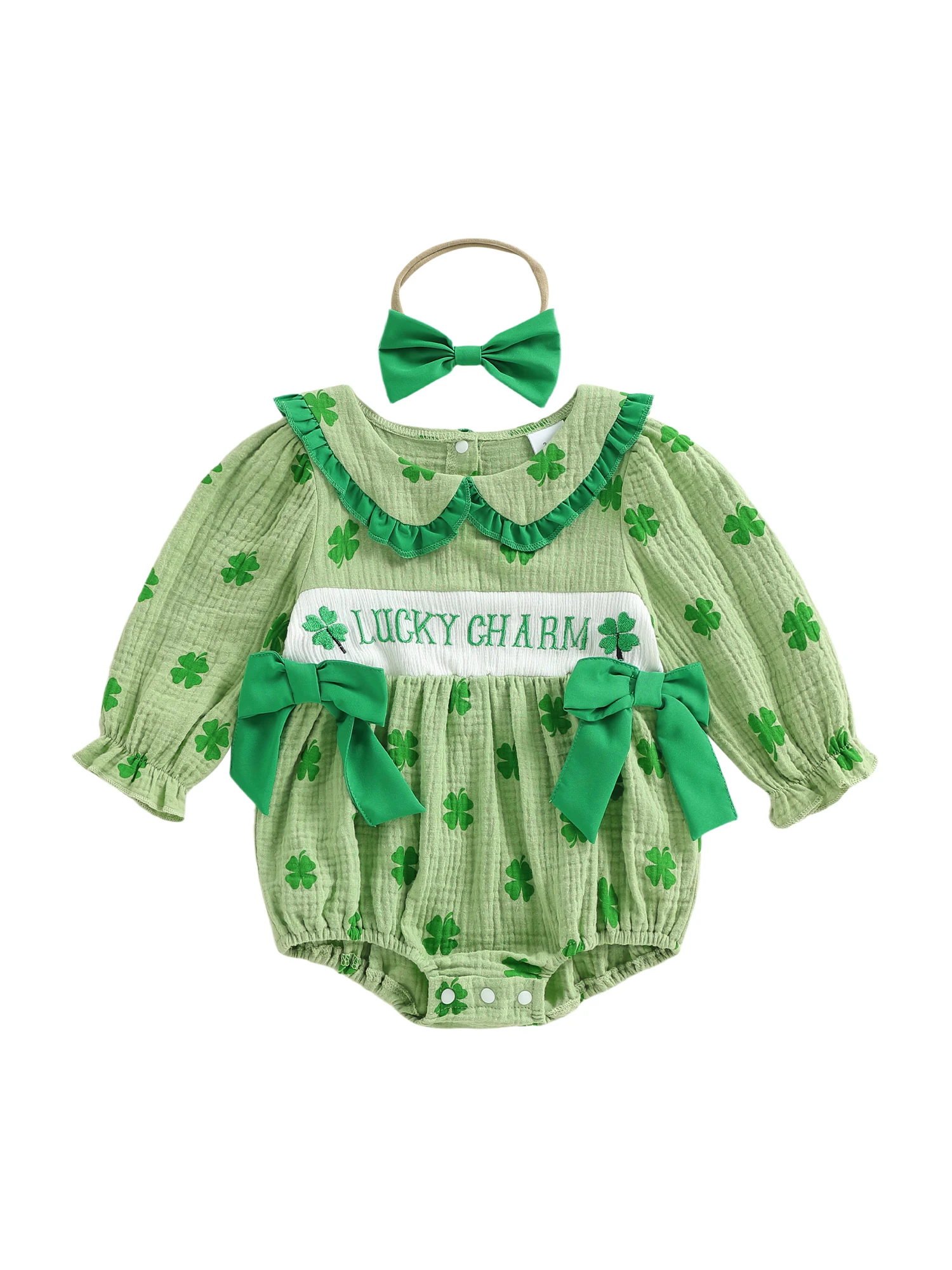 Baby Girl Irish Bubble Romper Fashionable Cute Shamrock Embroidery Long Sleeve Jumpsuit with Headband