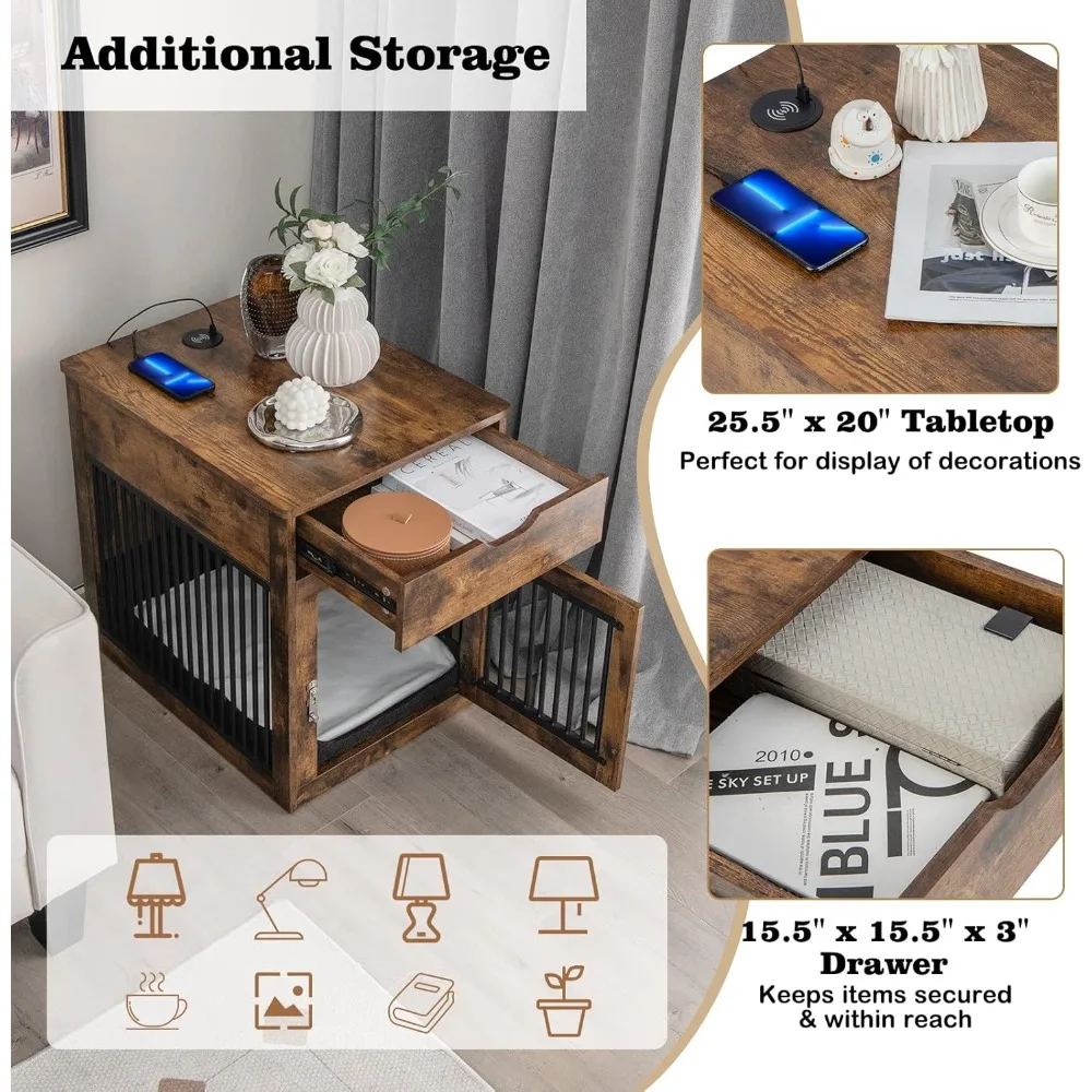 Dog Crate Furniture, Dog Kennel End Table with Chew-Proof Metal Fence, Lockable Door, Storage Drawer, Wired and Wireless