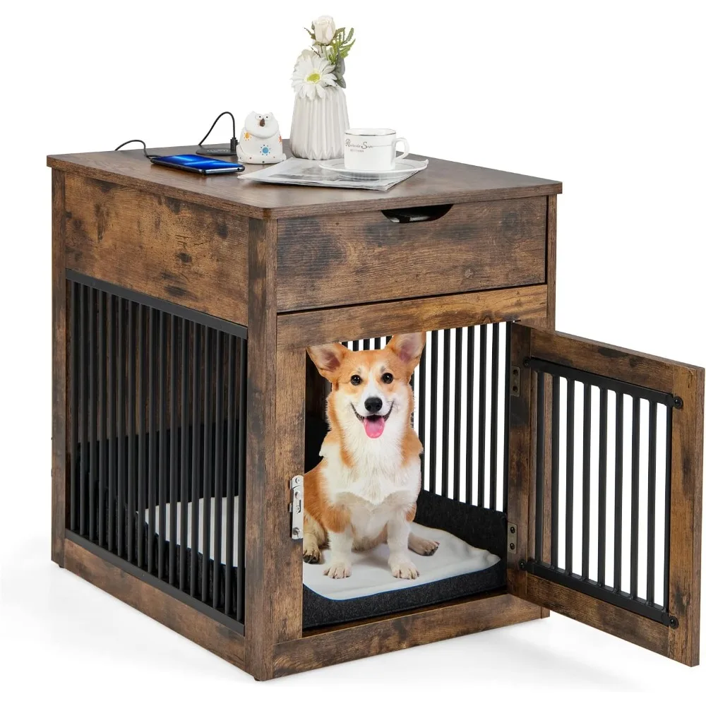This product is a multifunctional pet crate that doubles as a stylish piece of furniture. It features a removable and washable felt dog bed, making cleaning a breeze. The crate's interior measures 18 inches in length, 24 inches in width, and 16.5 inches in height, which is perfect for small dogs weighing between 11 to 25 pounds. The crate is equipped with a chew-proof metal fence, ensuring durability against dog chewing. It boasts 3-side ventilation, providing pets with a panoramic view while also allowing for easy supervision. The kennel is also fitted with non-slip foot pads for enhanced stability. For added security, the dog kennel comes with a door lock to prevent pets from escaping. Constructed from high-quality MDF and sturdy metal, the crate offers both stability and safety. The top of the crate can support a load of up to 100 pounds. In addition to its pet crate functionality, this product also serves as a side table with a drawer. It offers both wired and wireless charging options, including a USB port and a charging station, perfect for charging electronic devices like laptops, phones, or table lamps. There's also a cable management hole to keep power cords organized. This versatile pet furniture can be used as a pet crate, side table, end table, or nightstand, and the spacious drawer provides convenient storage for small items.