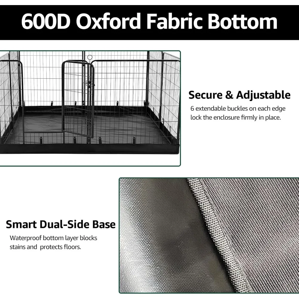 Introducing our 2024 upgraded dog playpen, complete with a storage bag designed for convenience. This bag is perfect for holding fence panels and stakes, ensuring a tidy vehicle space when traveling with your pet. The storage bag features wide, adjustable shoulder straps with comfortable padding, making it ideal for RV camping, road trips, and other outdoor activities. Our 8-panel, 32" high square dog pen measures 64" in length and width, with a height of 32". It boasts a top-opening dog door secured with dual latches, providing a spacious area of 4,096 square inches. This playpen is suitable for 4-5 small pets, making it perfect for expectant dog moms during whelping. This playpen is versatile, suitable for small to medium-sized pets such as dogs, ducks, chickens, guinea pigs, rabbits, and more. With the bottom pad fixed, the space can be used for eating, playing, and resting. The 600D Oxford bottom pad comes with 6 hooks on each side to secure the playpen, preventing it from tipping over and protecting your floors. The pad also features a waterproof surface, offering partial leak resistance. For pets that tend to chew, consider placing a blanket or pee pad over the bottom pad to extend its life. Cleaning is simple; just rinse with water, as machine washing is not recommended. Your dog pen arrives double-wrapped in a cardboard box and Oxford storage bag to minimize shipping damage. The package includes 1 door panel, 7 regular panels, 8 stakes, 1 bottom pad, and 1 storage bag. If any parts are missing, contact us immediately, and we'll provide a solution within 24 hours. The 8 panels of the playpen can be configured into various shapes, including a square, rectangle, octagon, or other forms. A quadrilateral base fabric is included, and rectangular/octagonal bases (bottom pads sold separately) are available under specific ASINs. We care about our customers and are committed to providing high-quality playpens and service. Our customer team is responsive, aiming to reply within 24-48 hours. Reach out anytime for assistance.