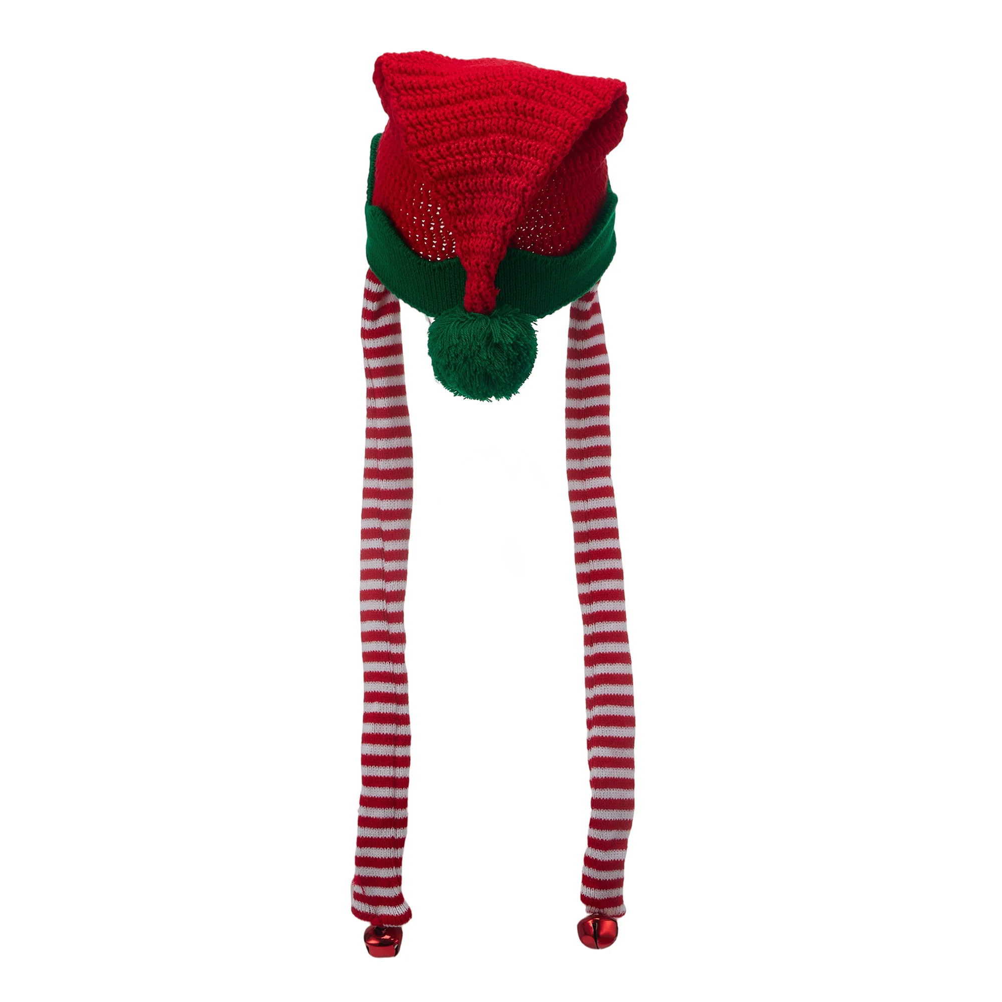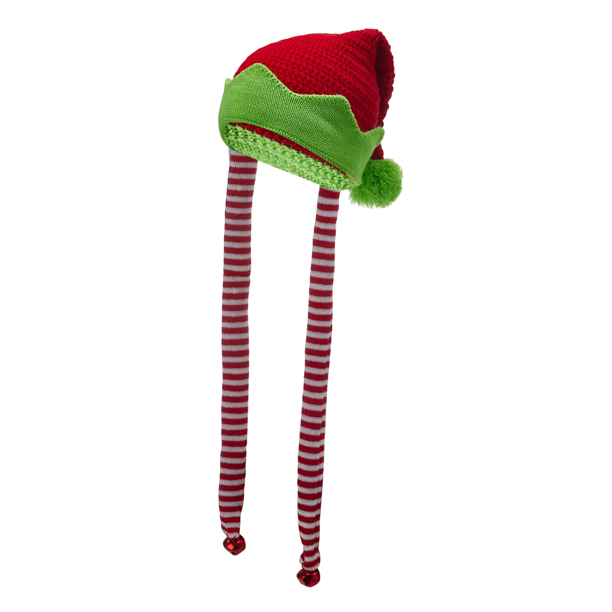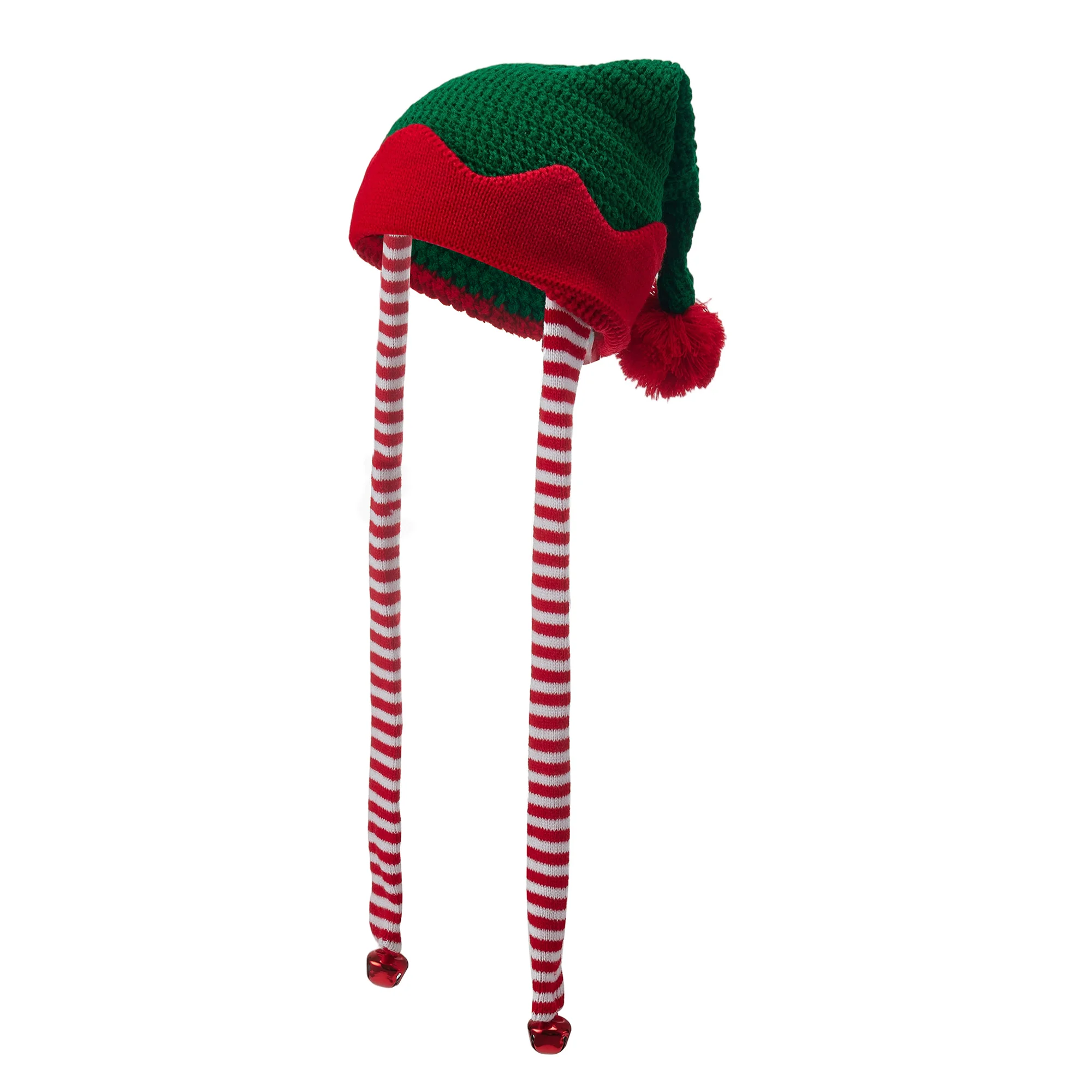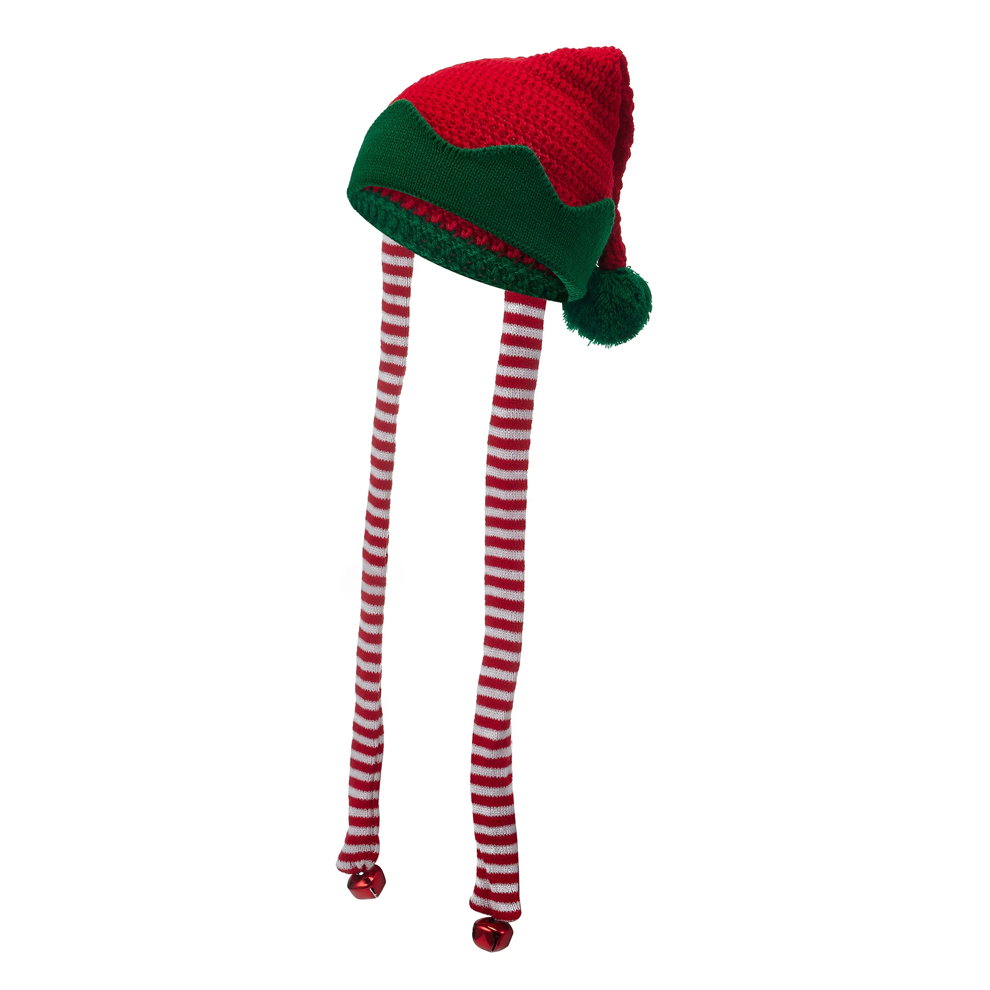 Christmas Hat with Striped Earflaps Bells Windproof Warm Party Knitted Elf Beanie for Adult
