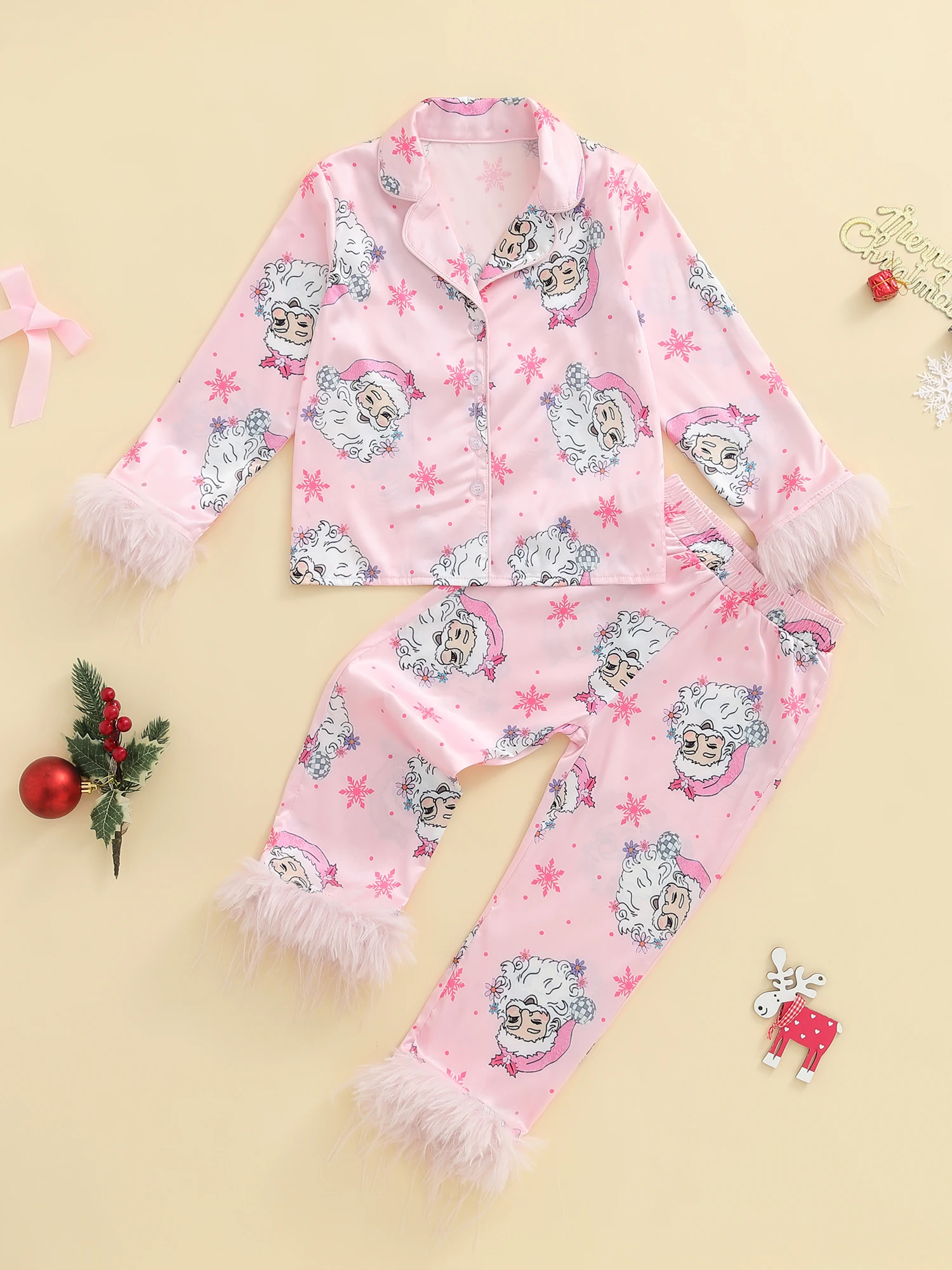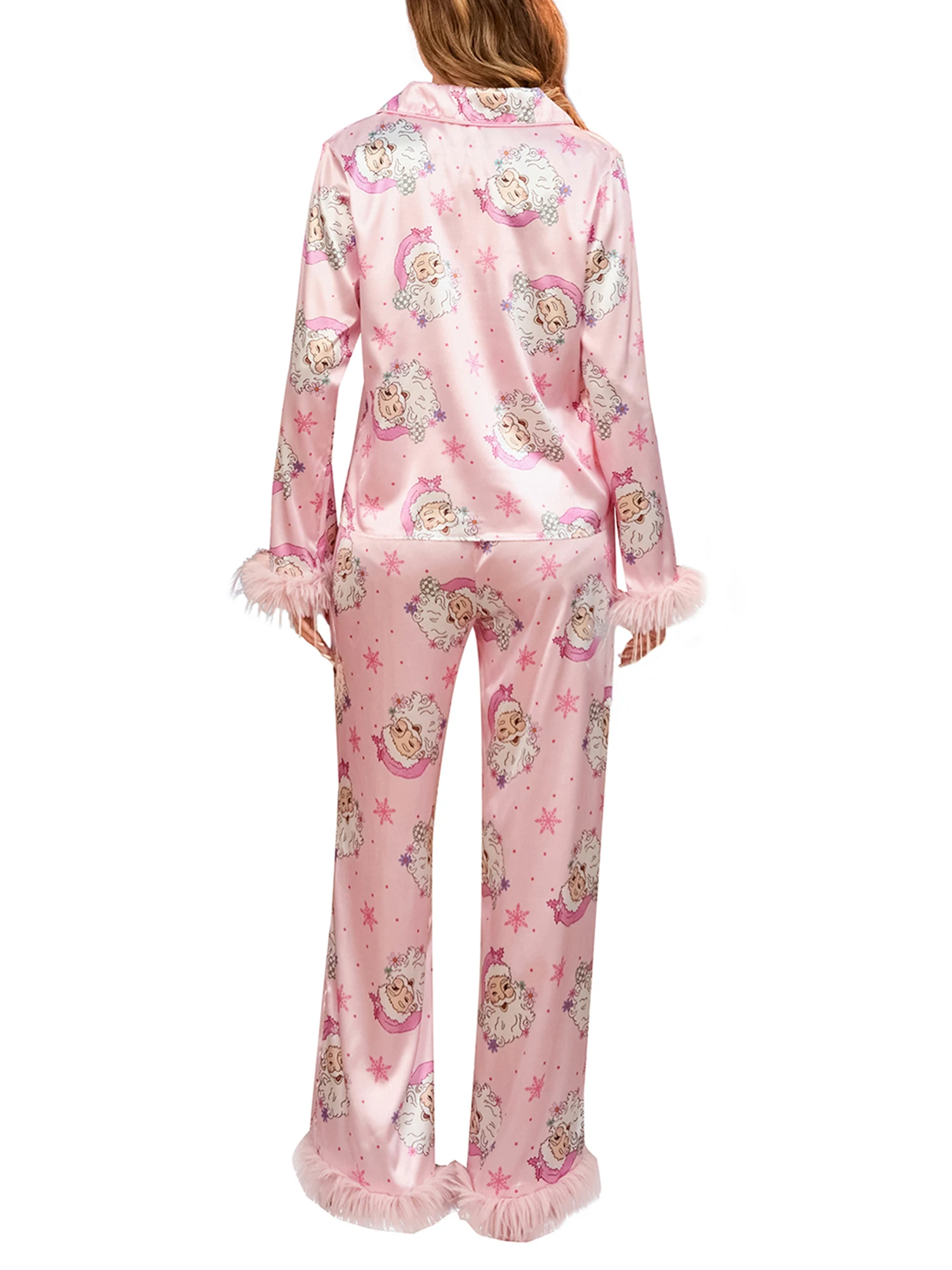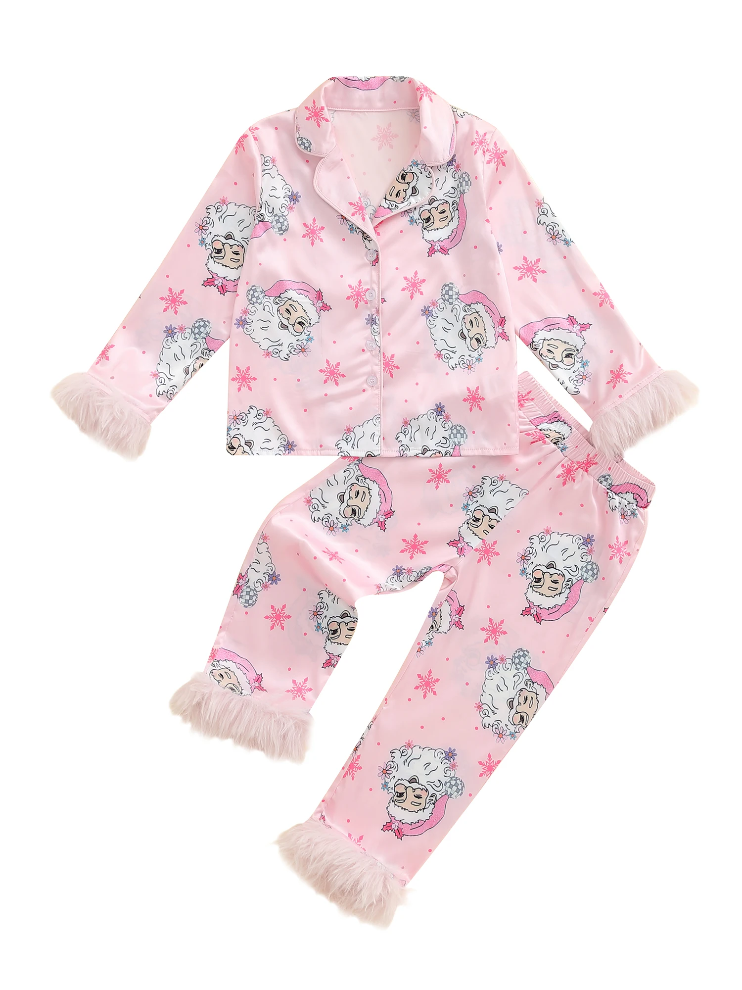 Mommy and Me Matching Pajamas Santa Print Button Down Long Sleeve Lapel Tops Pants Family Christmas Satin Sleepwear