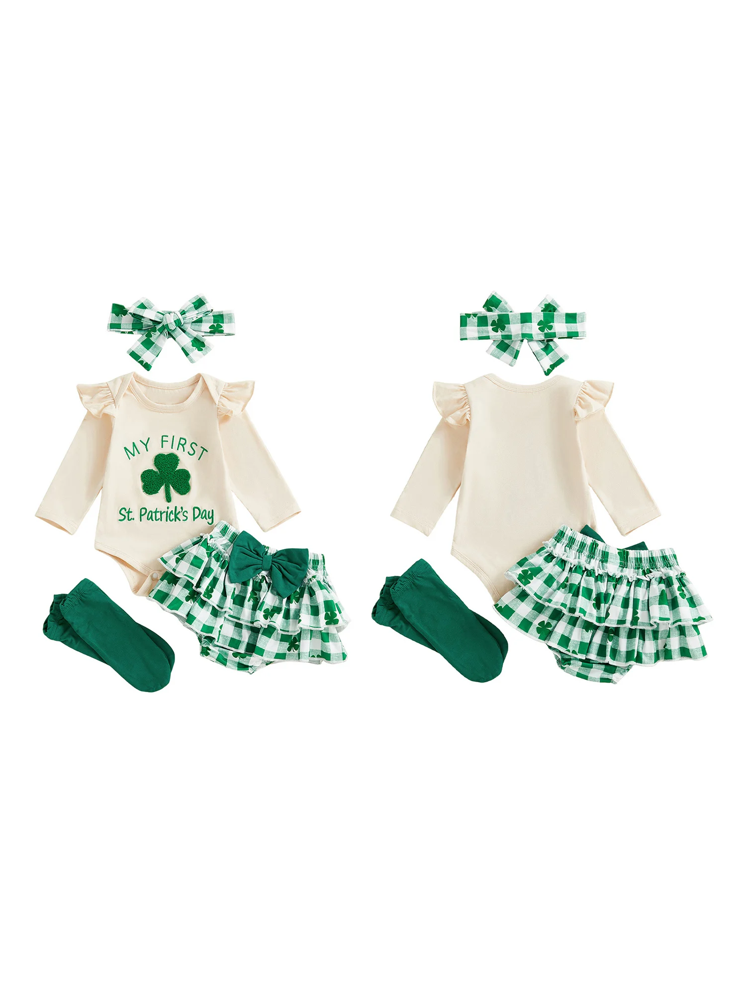 St Patrick s Day Toddler Girls 4 Piece Set with Clover Embroidery Long Sleeve Jumpsuit Headband Skirt and Leg Warmers for