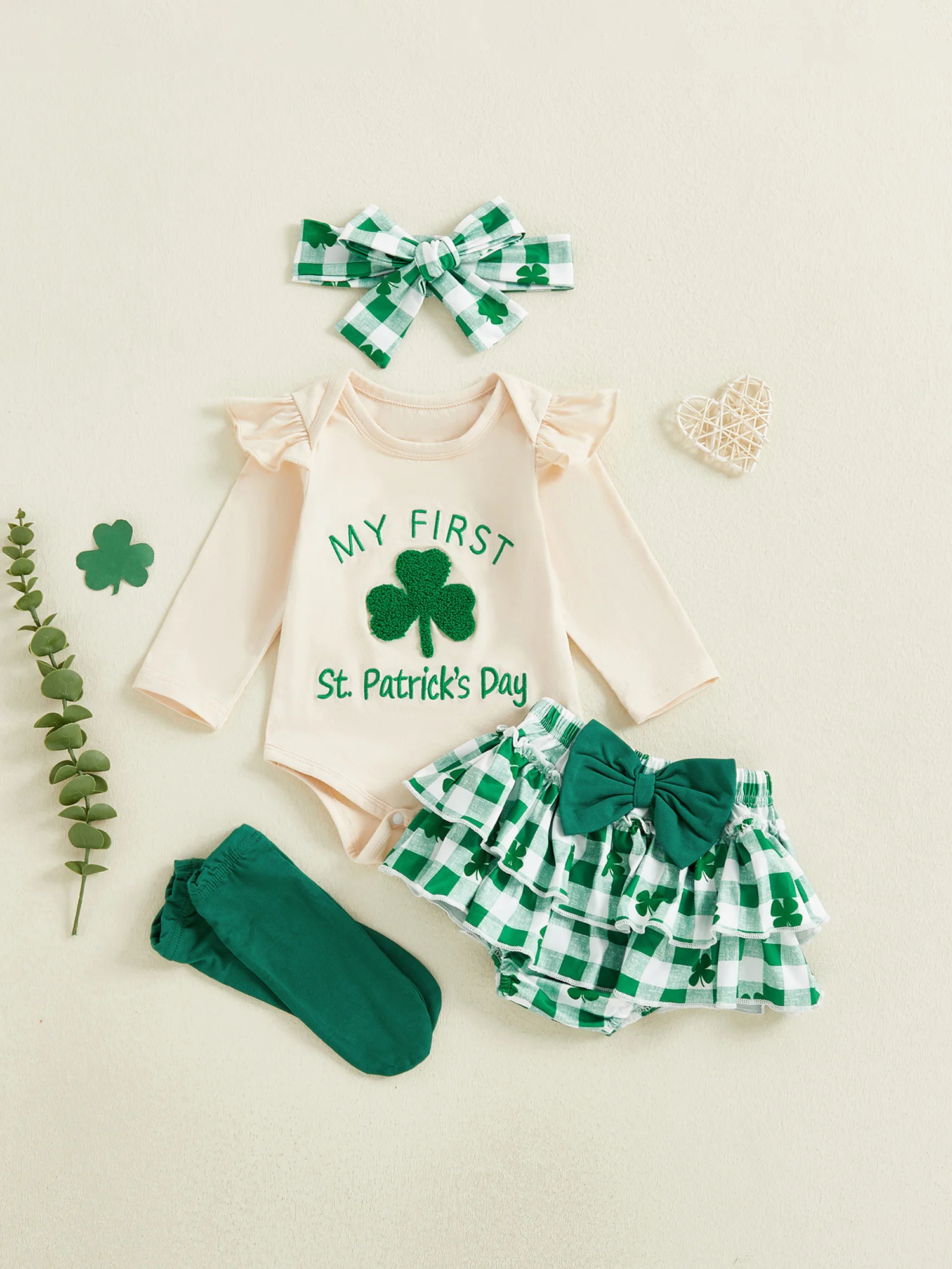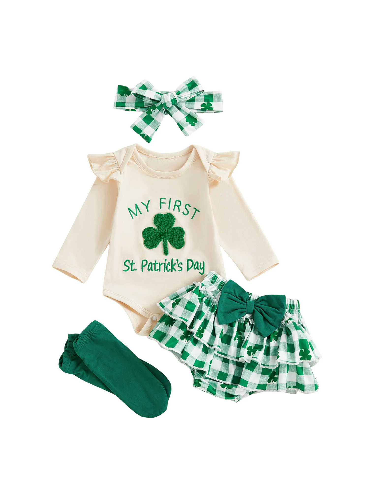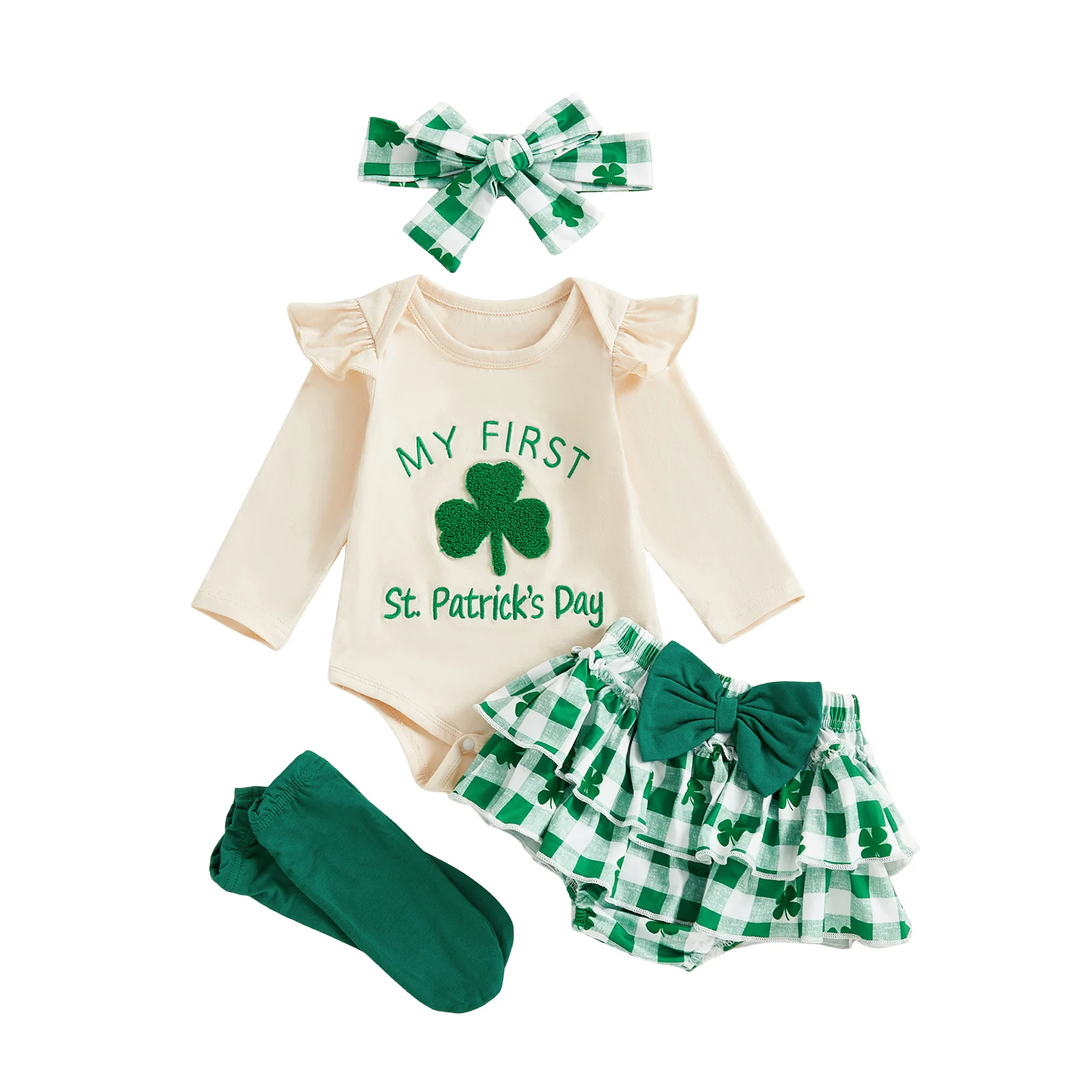 Irish Festival Baby Girls 4 Piece Outfit Long Sleeve O Neck Letter Shamrock Embroidery Jumpsuit Headband Skirt Leg Warmers Set